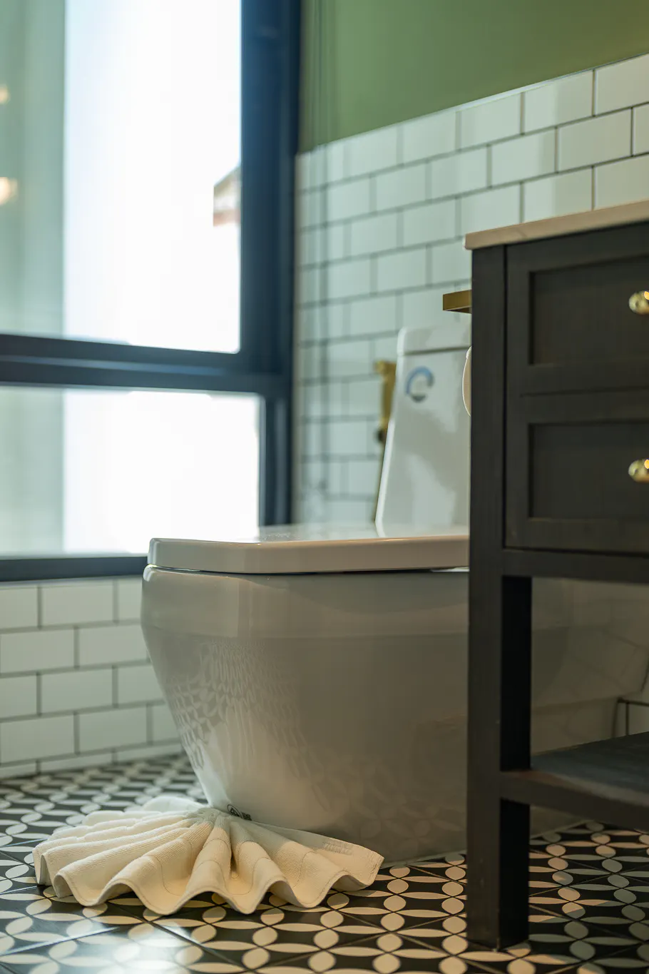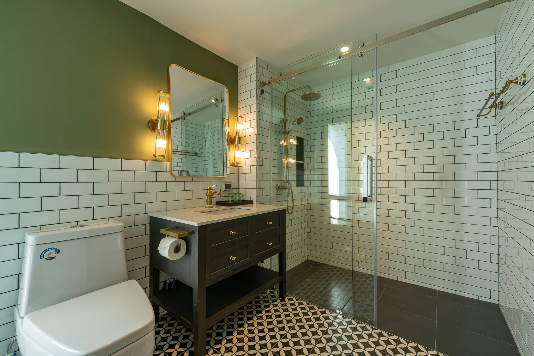 พร้อมกับอ่างแช่น้ำที่สามารถเพลิดเพลินกับวิวสวนและวิวสระว่ายน้ำ การตกแต่งผสมผสานความทันสมัยเข้ากับเสน่ห์แบบโคโลเนียล