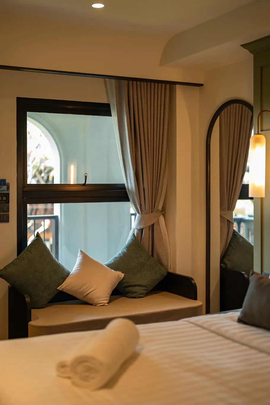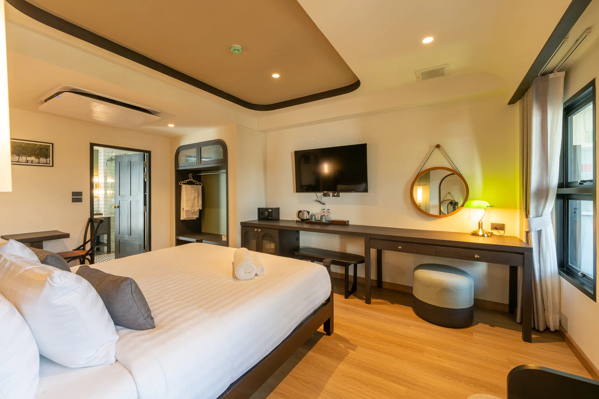 ค้นพบความลงตัวของความสะดวกสบายและฟังก์ชันการใช้งานในห้องซูพีเรีย คิงไซส์ ขนาดห้องพัก 27.5 ตารางเมตร ที่ออกแบบอย่างลงตัวพร้อมเฟอร์นิเจอร์ครบครัน เช่น โซฟา โต๊ะทำงาน และกระจกเต็มตัว