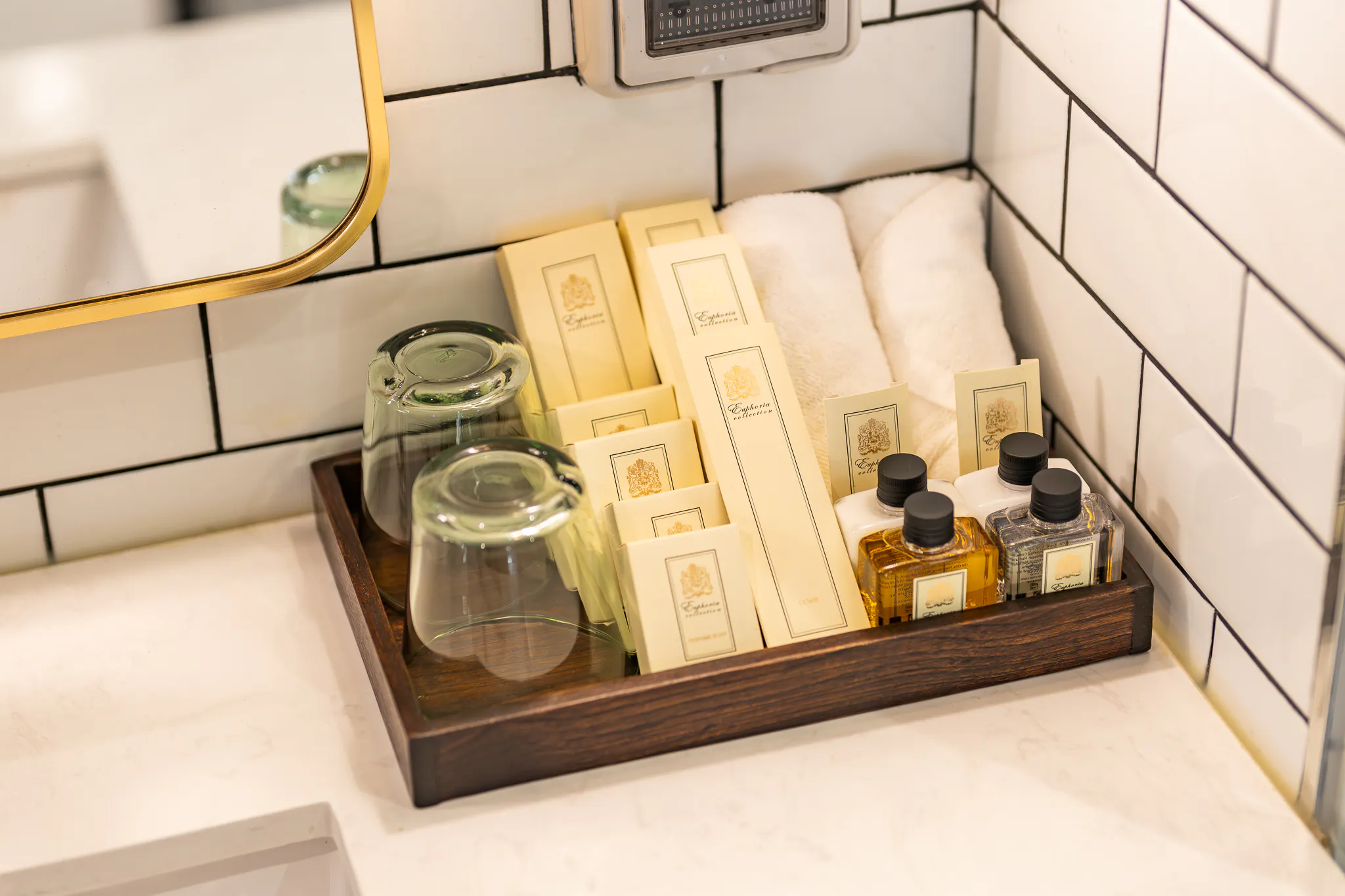 ผ่อนคลายในพื้นที่นั่งเล่นที่มีโซฟาและโต๊ะ หรือชมภาพสะท้อนในกระจกเต็มตัว ห้องนี้ยังมีมินิบาร์และสิ่งอำนวยความสะดวกคุณภาพสูง